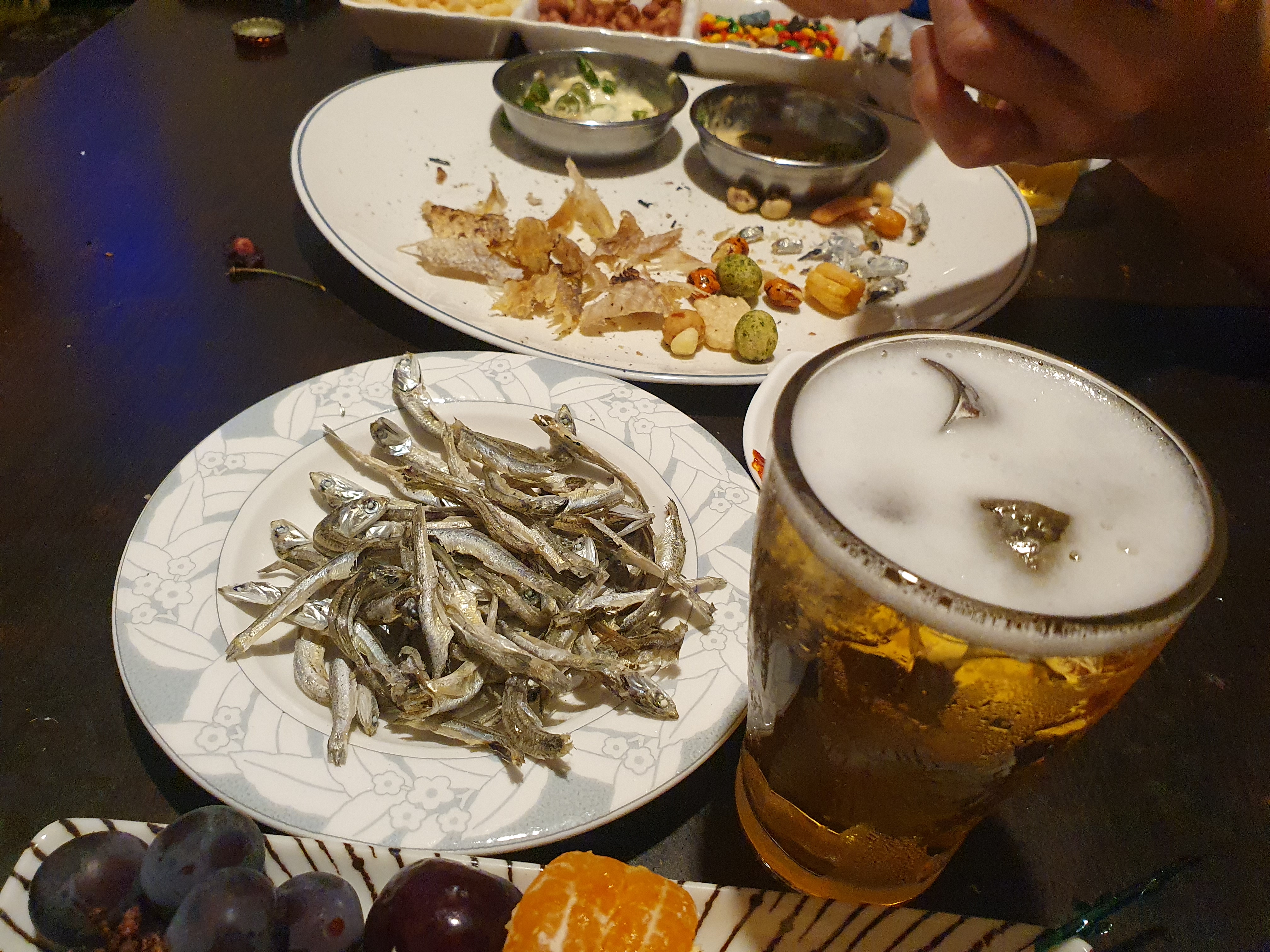 얼음을 넣은 시원한 맥주와 마른멸치 안주의 조합이 좋았습니다.