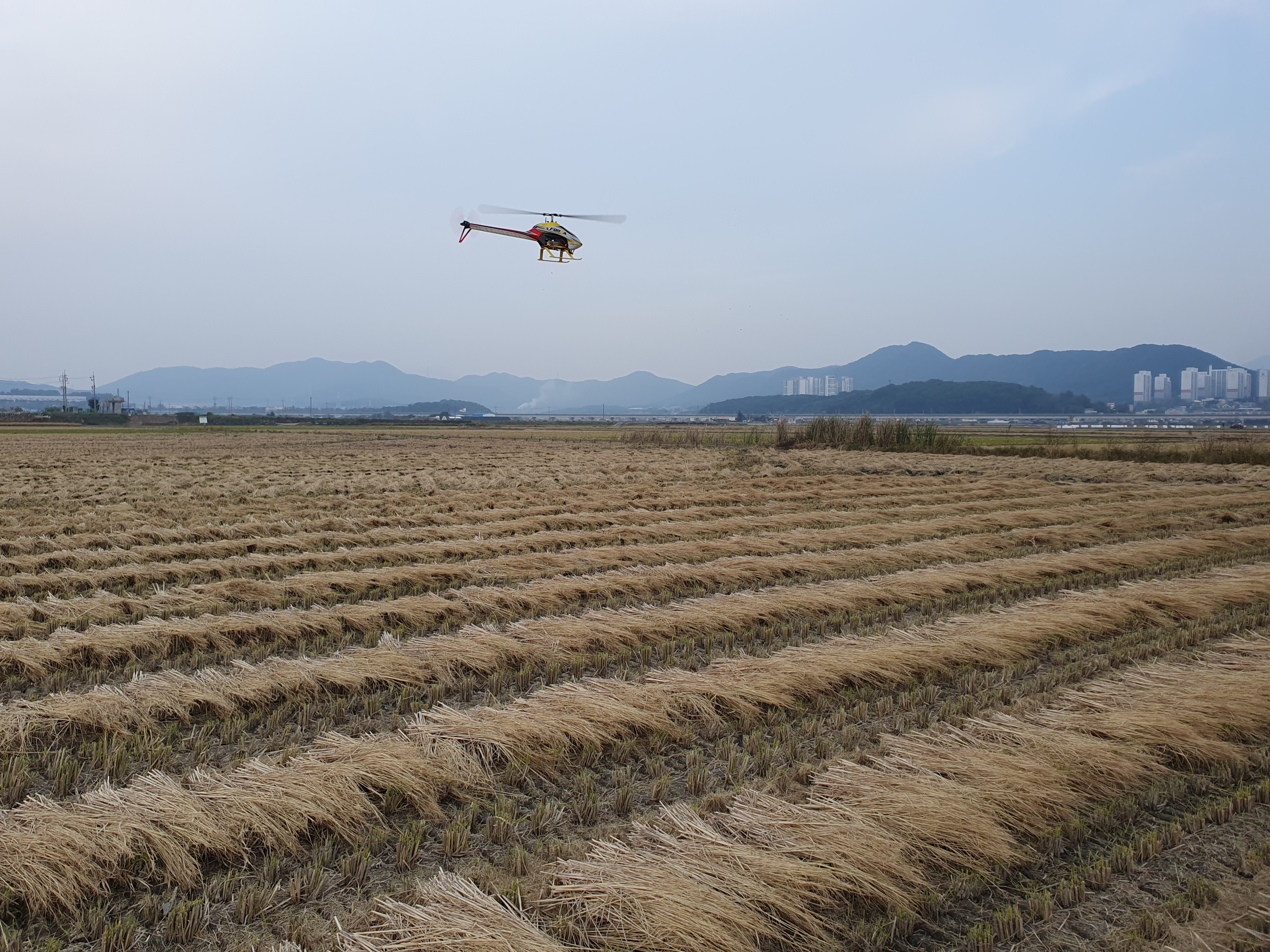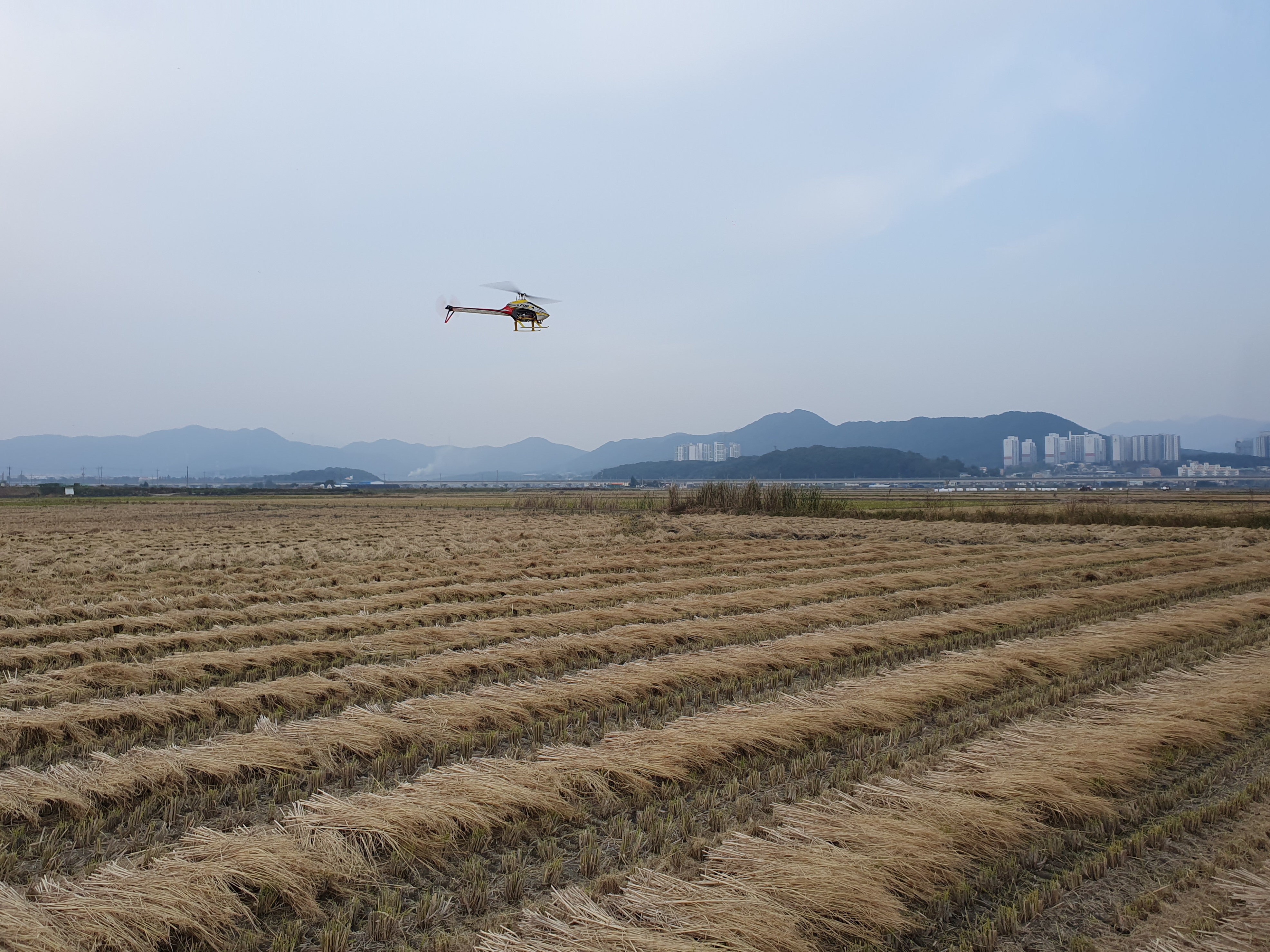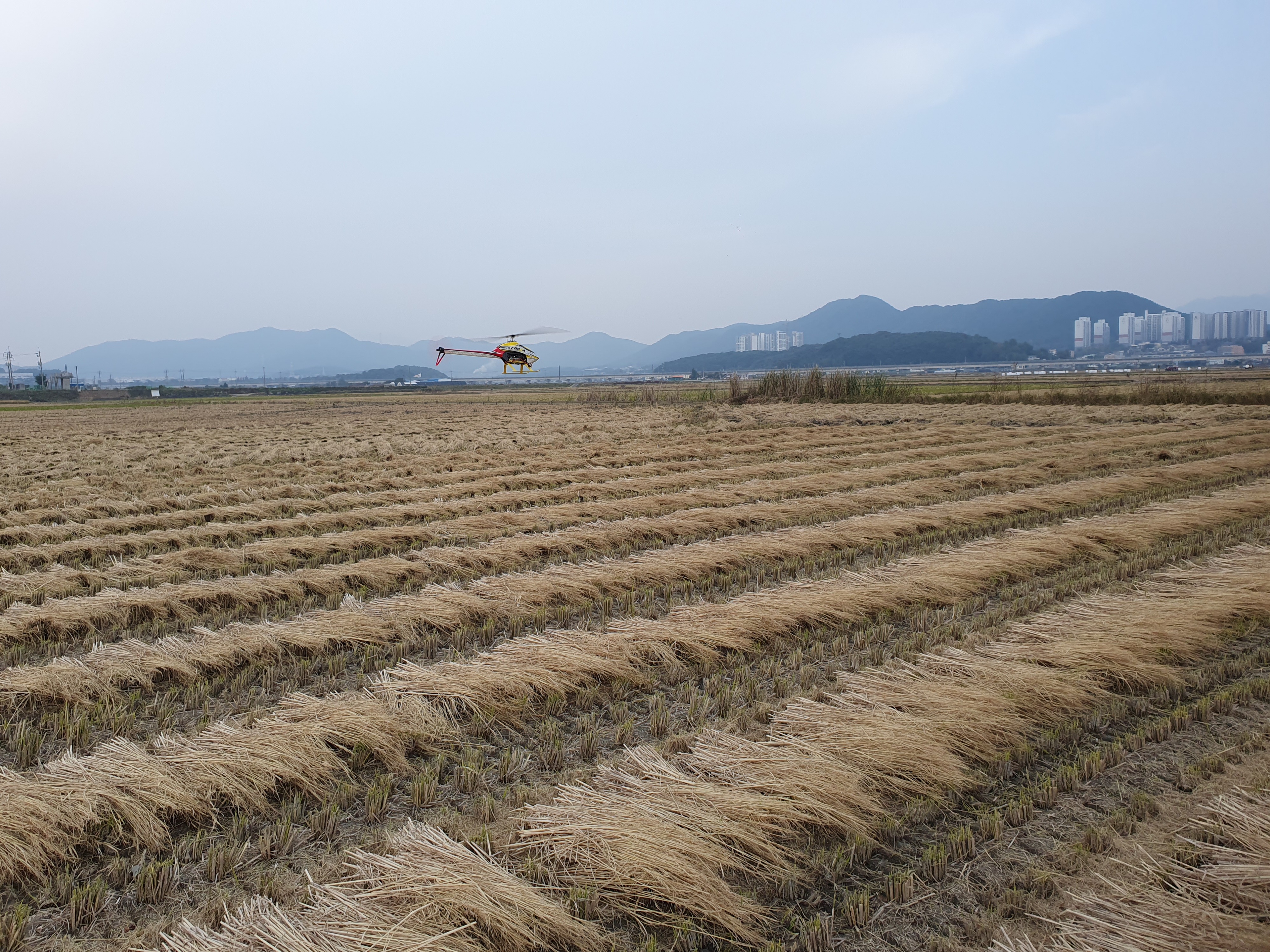 황량한 들판을 배경으로 비행을 마치고
